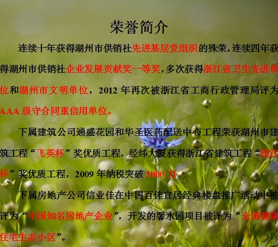 | 集團一直圍繞著“關注生命,關注環(huán)境”的產(chǎn)業(yè)布局方針,做強做大以房地產(chǎn)為龍頭,建筑、裝飾、新型材料、貿(mào)易、為輔助產(chǎn)業(yè)的建筑產(chǎn)業(yè)鏈;做精做活以制藥、化工為重要產(chǎn)業(yè)布局的新興產(chǎn)業(yè)鏈。公司連續(xù)多年被評為浙江省重合同守信用單位,連續(xù)13年被評為湖州市供銷社本級企業(yè)發(fā)展貢獻獎一等獎,并多次獲得浙江省優(yōu)秀民營企業(yè),全省供銷社50強企業(yè),供銷社系統(tǒng)先進基層黨組織等榮譽稱號。 |